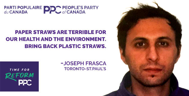 I’m Joseph Frasca, a proud lifelong member of the Toronto—St. Paul’s community and the official candidate for the People’s Party of Canada. I stand for freedom, personal responsibility, respect, and fairness—values that drive my commitment to restoring Canada’s prosperity and empowering its people through bold convictions. My platform is distinct, focusing on real environmental solutions, genuine rights advocacy, and deep respect for both Canada's history & Indigenous communities. I’m also vehemently opposed to plastic straws, which harm our planet more than you think- not to mention ruin any beverage experience. Support me today to bring the change Toronto—St. Paul’s needs!